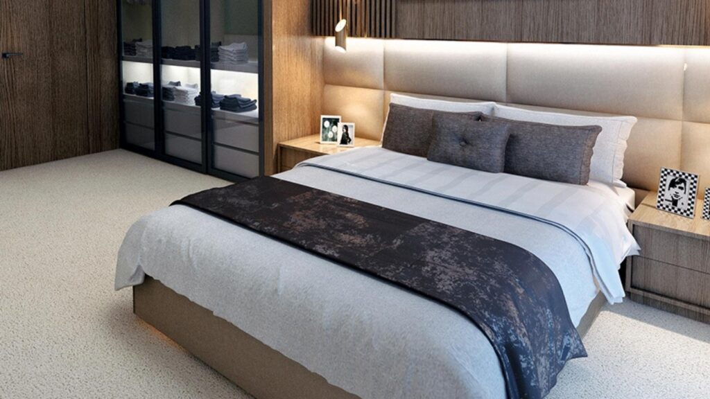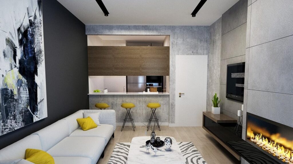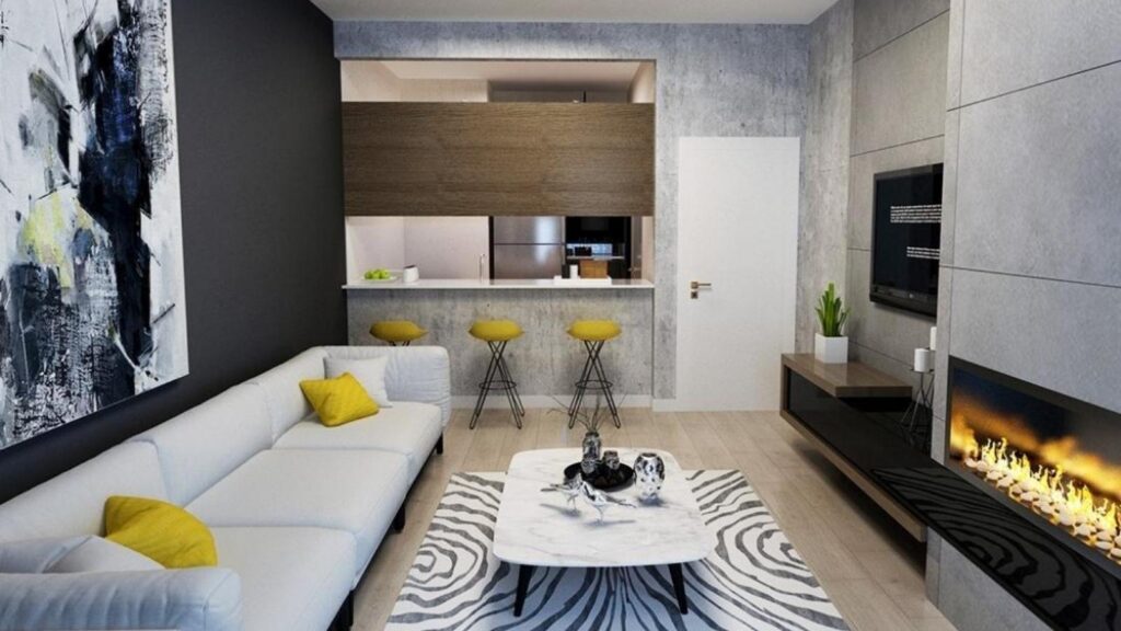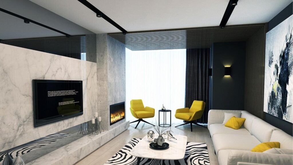 The design of the studio apartment located in Akbatı Residence, Mavi Kule, is enhanced with warm and modern tones of anthracite, gray, and yellow. The fireplace and television, positioned on the same wall surface, become the focal point of the space. The marble cladding and smoke-toned mirror on this wall not only create visual appeal with aesthetic emphasis but also add depth to the space, creating a sense of dimension.