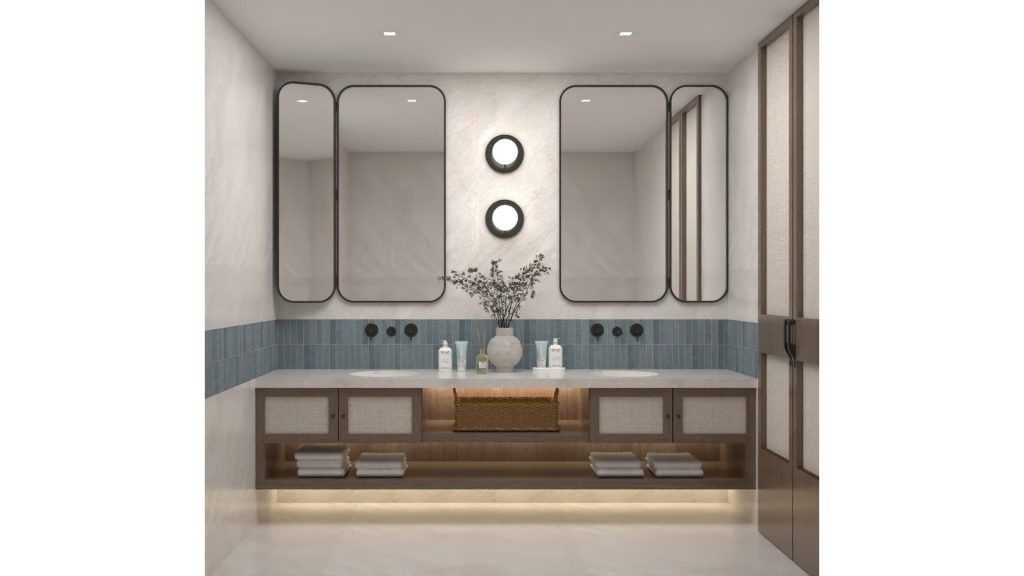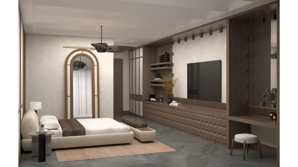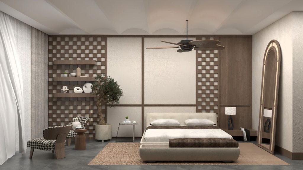 Nature-inspired materials and soft forms are at the forefront of this room design. Wooden textures and neutral colors give the space a peaceful and simple character. The knitted patterned surfaces used on the wall panels provide visual rhythm and add movement to the space. The seating area is placed in a corner where natural light is intensely felt and the overall setup is supported by light tones, providing a spacious environment.