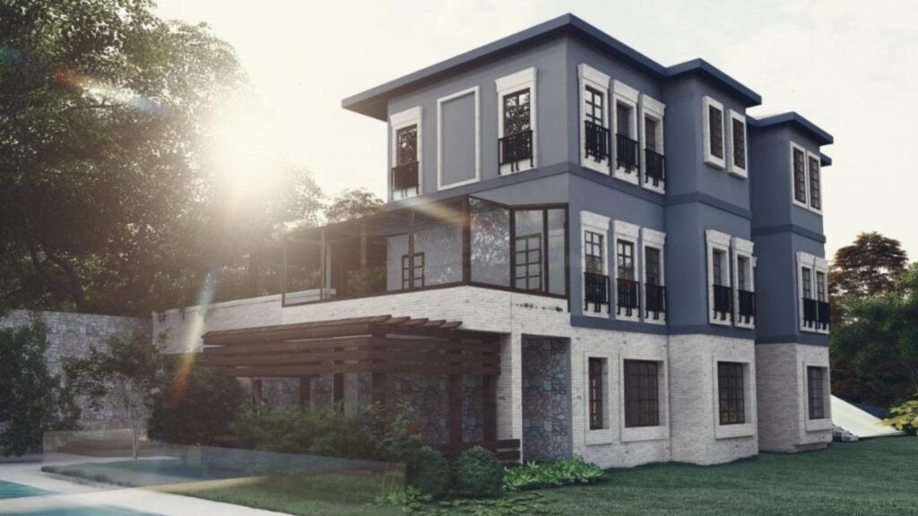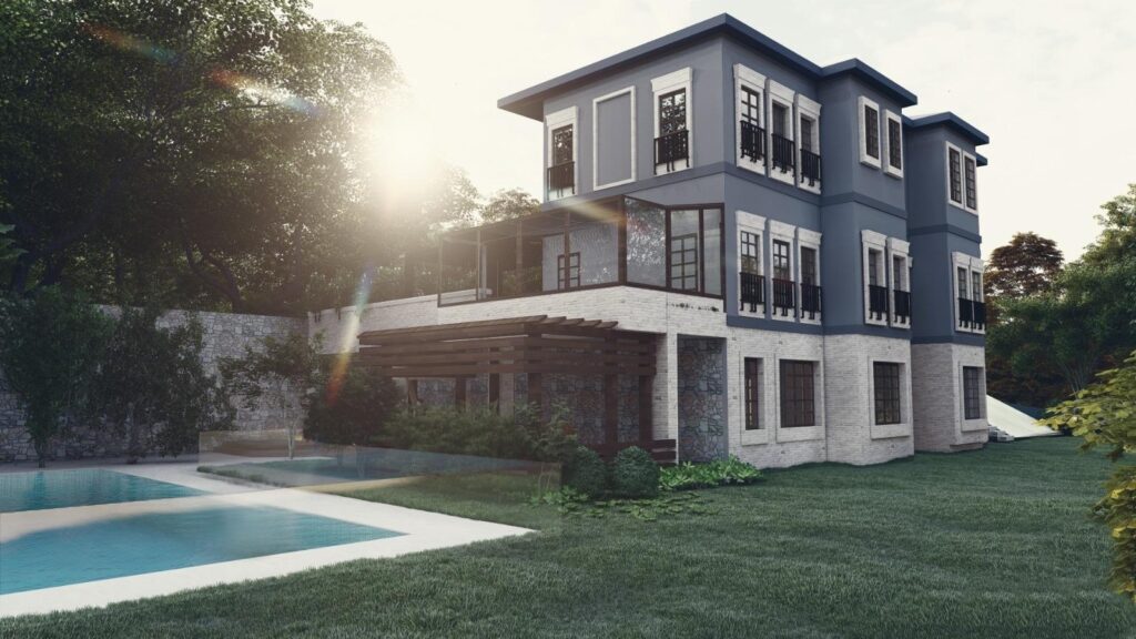 The garden and exterior design of the three-story villa have been redesigned and implemented with a modern approach. The garden area has been enriched with pathways paved with natural stones, stylish seating corners, and colorful plant arrangements. Additionally, the garden has been made more enjoyable and relaxing with lighting fixtures. The exterior facade, designed with contrasting colors, contributes to giving the villa a modern and elegant appearance. The natural stone claddings and wooden touches used on the facade emphasize the environmental harmony of the villa.